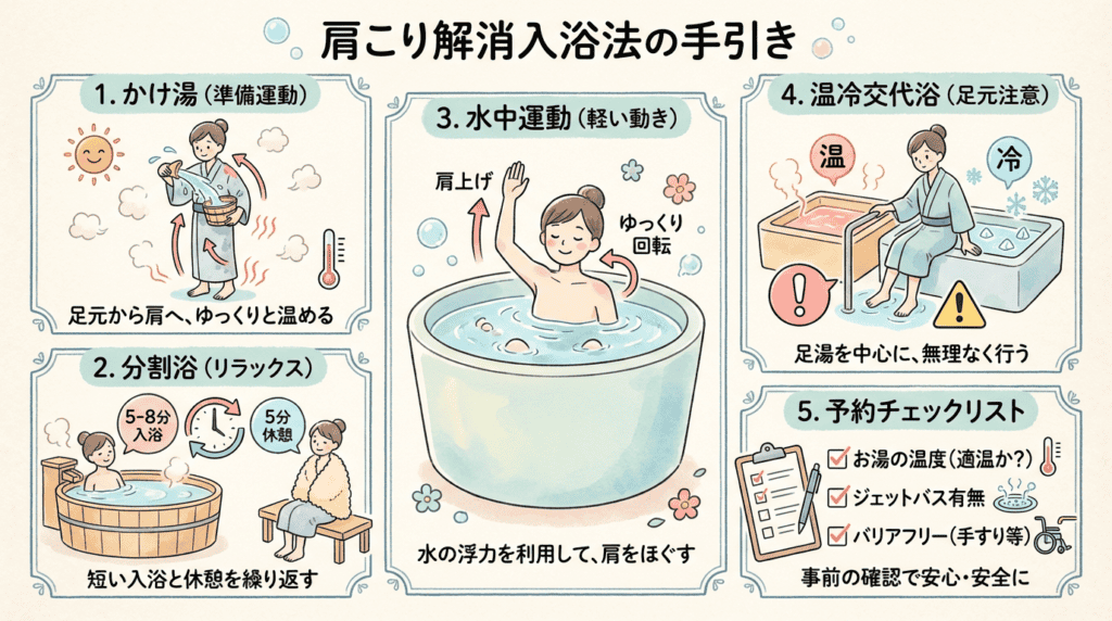 “いい宿”を選んでも、入り方が雑だと体感が伸びません。ここでは、肩まわりのこわばりを和らげるための入浴法をご紹介しますね。