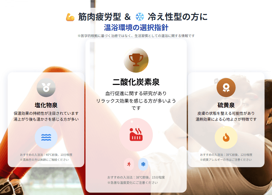 泉質の種類 | 💪 ガチガチ 筋肉・疲労型 | ⚡ ズキズキ 神経・しびれ型 | ⚙️ ゴワゴワ 関節・動作痛型 | ❄️ じんじん 冷え・血行不良型 |