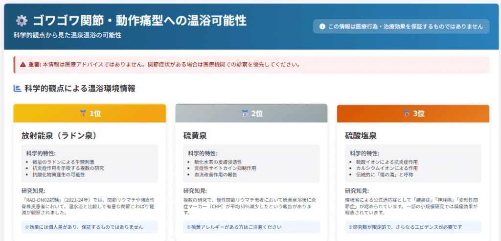- 理由: 硫黄泉と同様に国の公式な適応症。鎮静と組織修復で関節をケア。