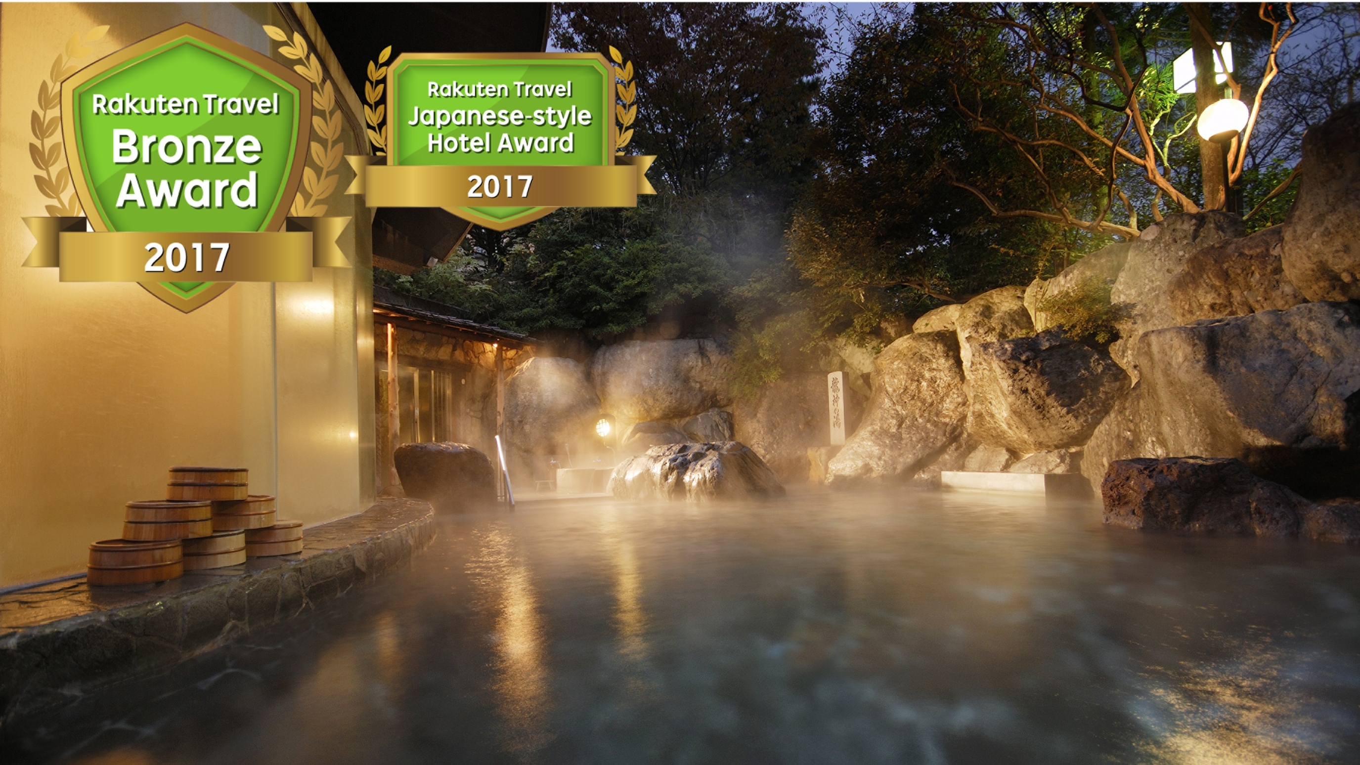 楽天トラベル口コミ抜粋:「これだけの種類の温泉に入れるのは圧巻。日替わりで色々試しているうちに、腰が楽になりました。滝の流れる露天風呂も最高です。」